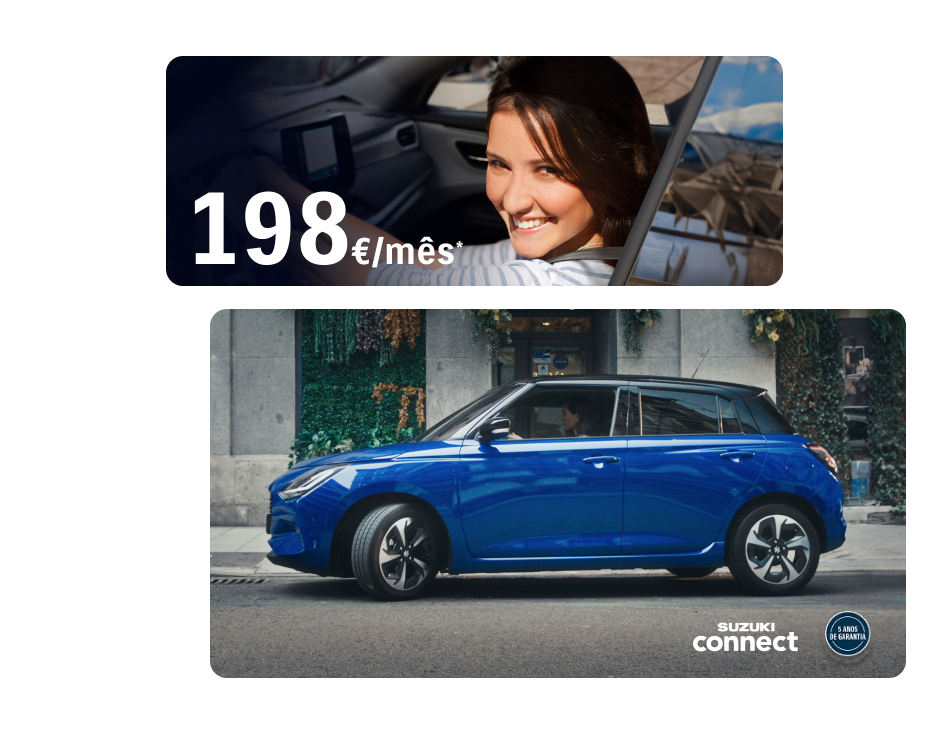 *PVP recomendado válido no Continente para Suzuki Swift 1.2 5MT S1 Mild Hybrid, inclui despesas de legalização, transporte e preparação, em Aluguer Operacional de Viaturas a 72 meses/60.000 km. 1º Aluguer Diferenciado 7.201€. Não incluído IUC e Seguro obrigatório. Inclui manutenção preventiva. Visuais não contratuais. Condições válidas até 31/12/2025. Reservado aos Concessionários Oficiais Suzuki aderentes. Informe-se no Santander Consumer Services S.A